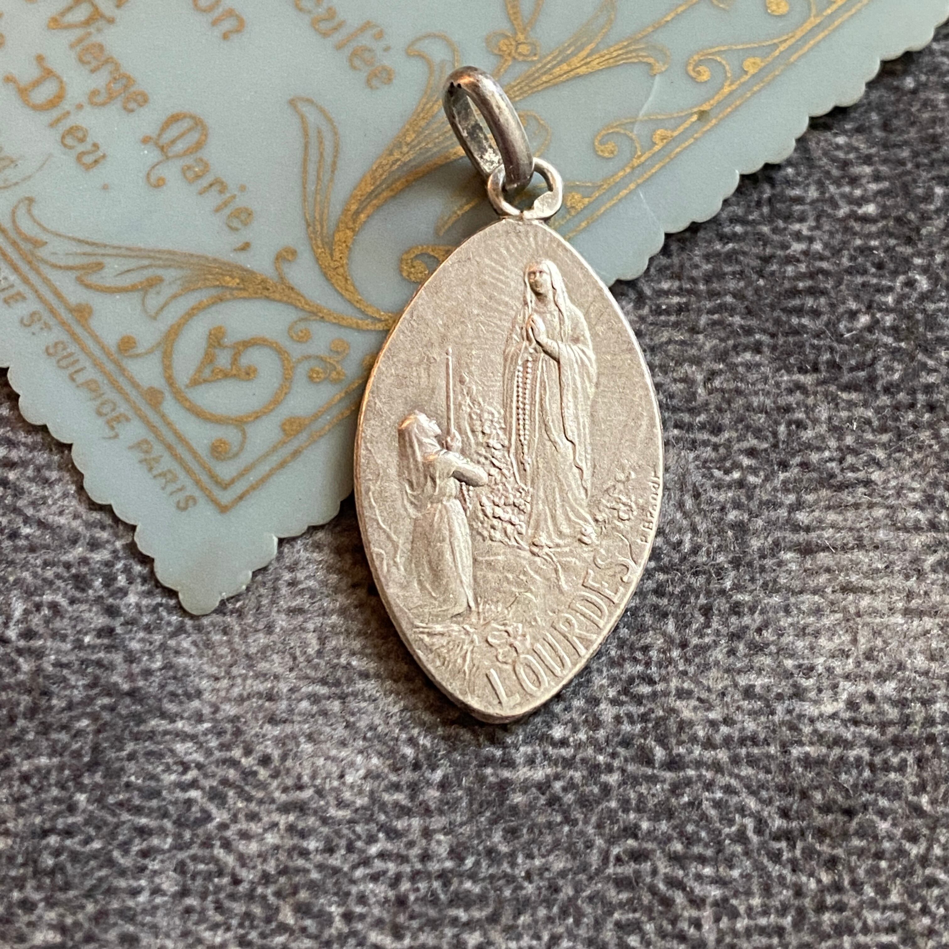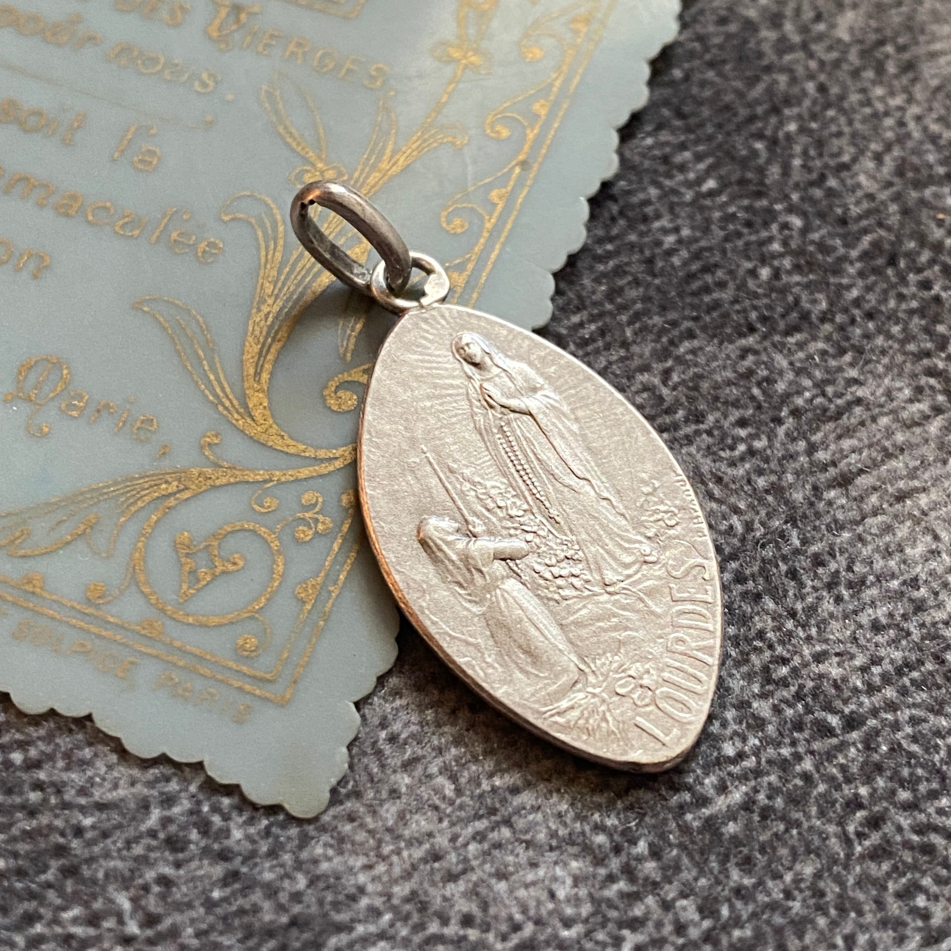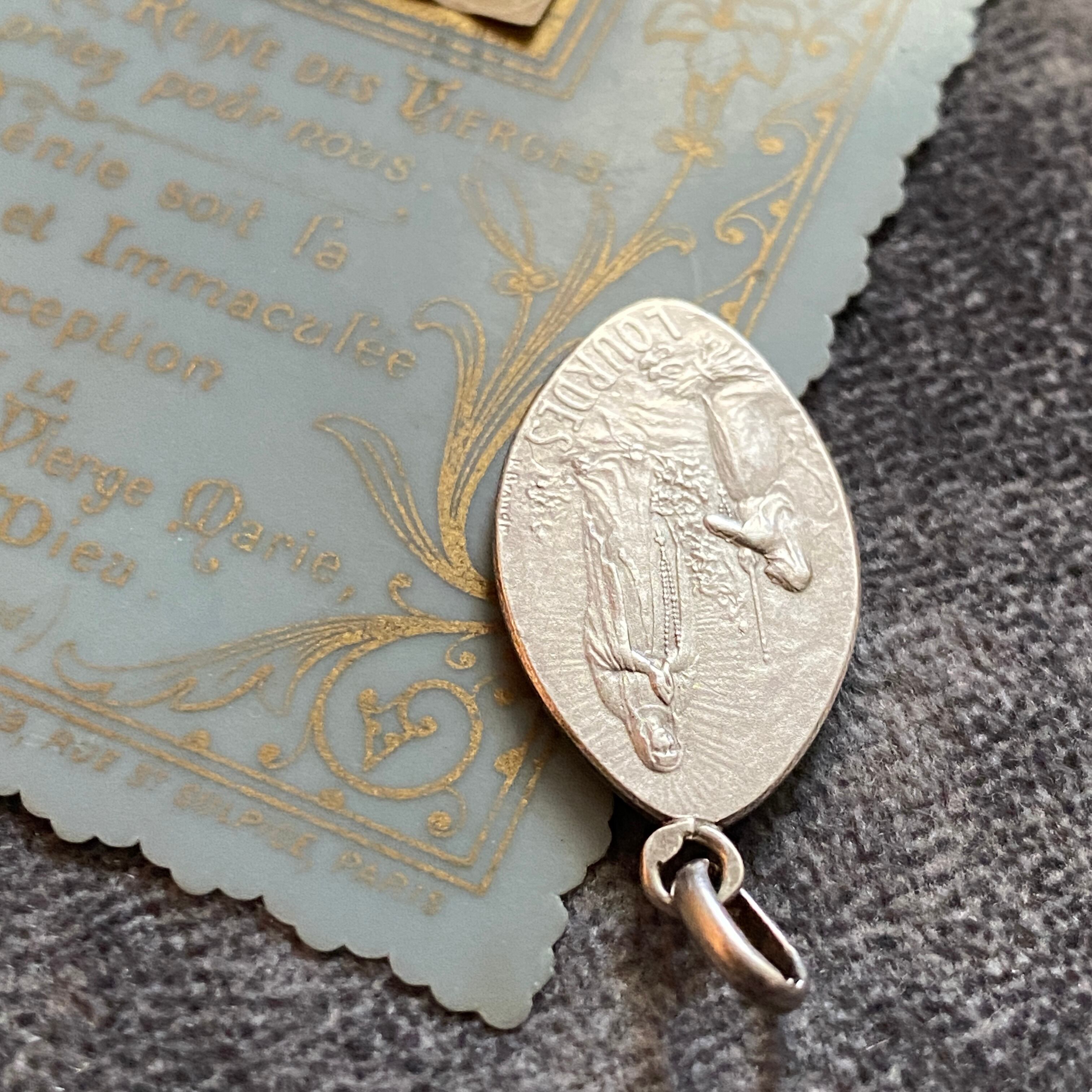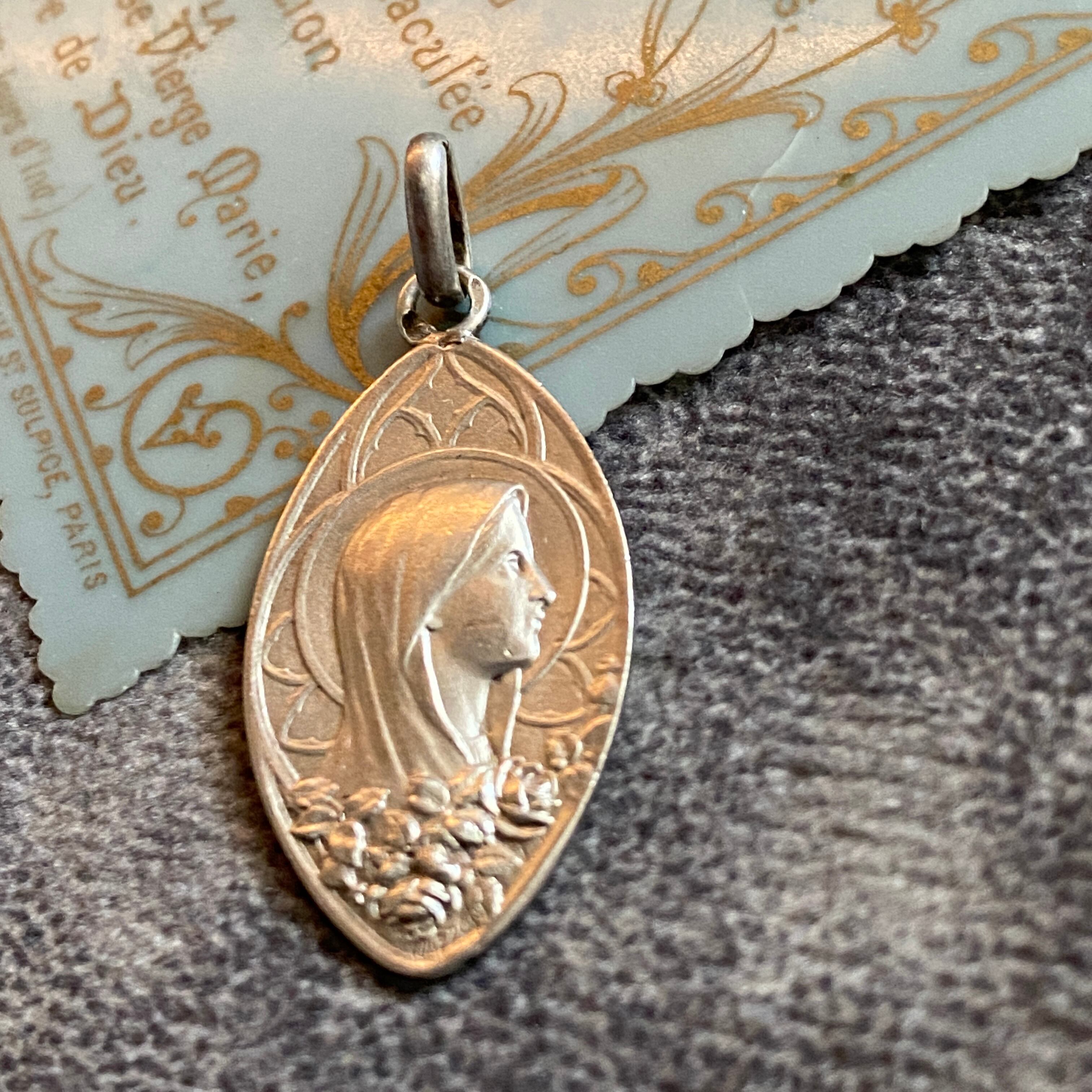 アーモンド型の上品な型の中には、繊細に咲き誇る薔薇の上にマリアさまの横顔が描かれています。
