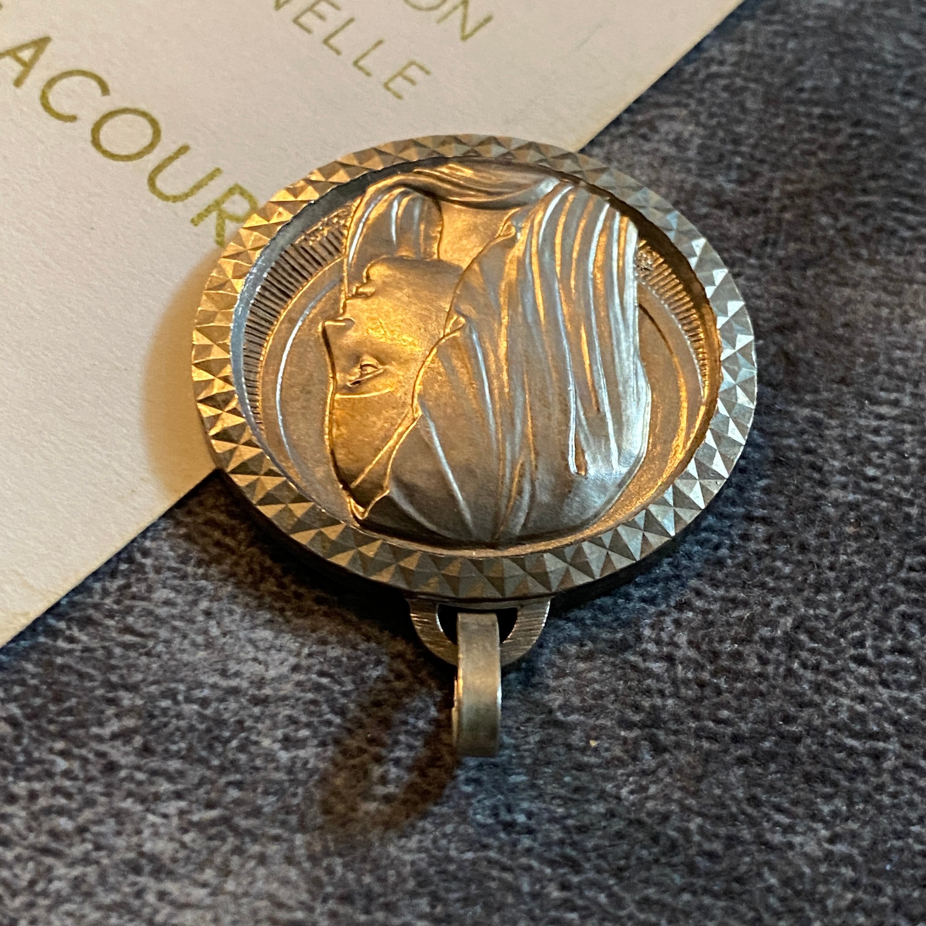 特徴ある打ち出し加工のフレームから、力強くマリアさまの祈りが伝わる作品。