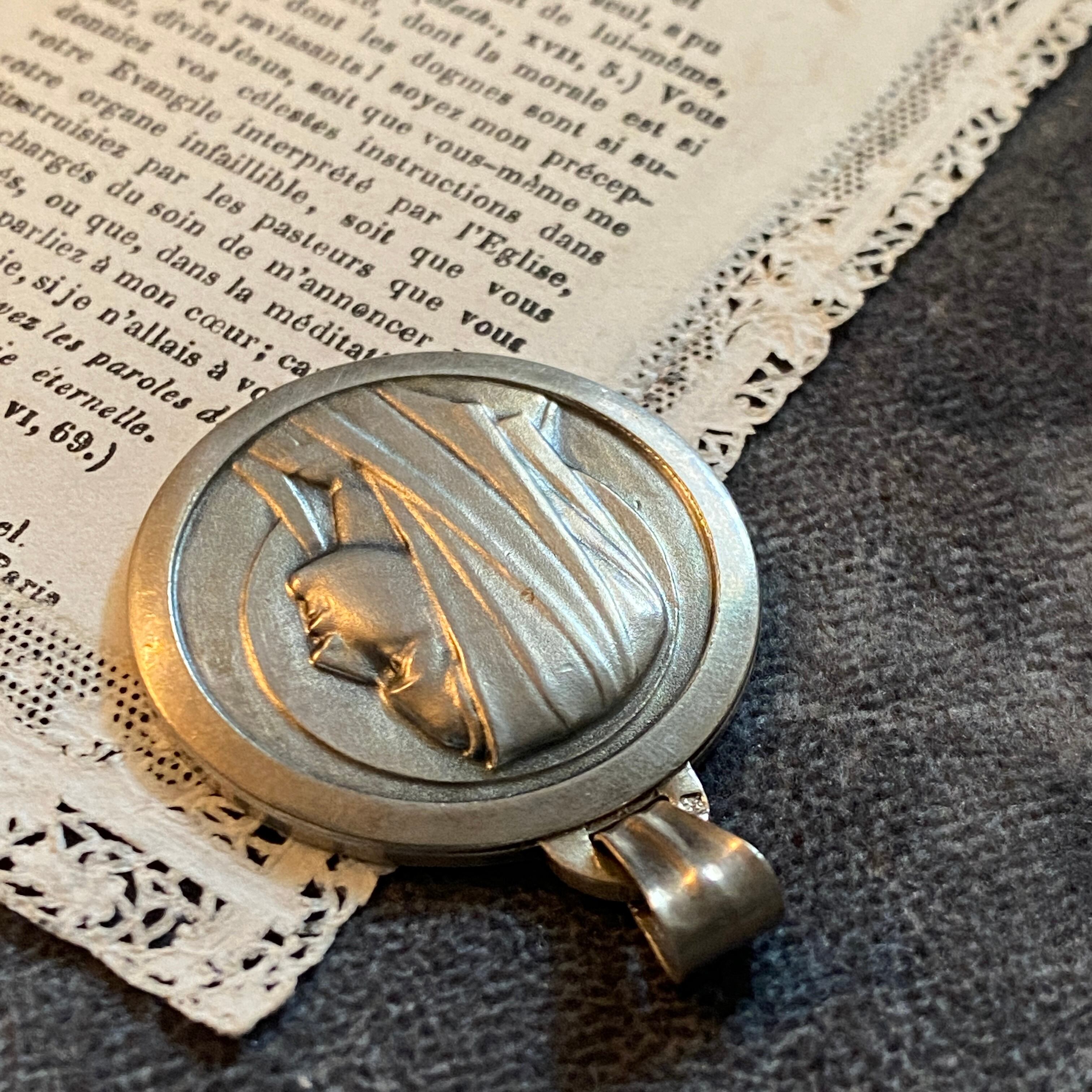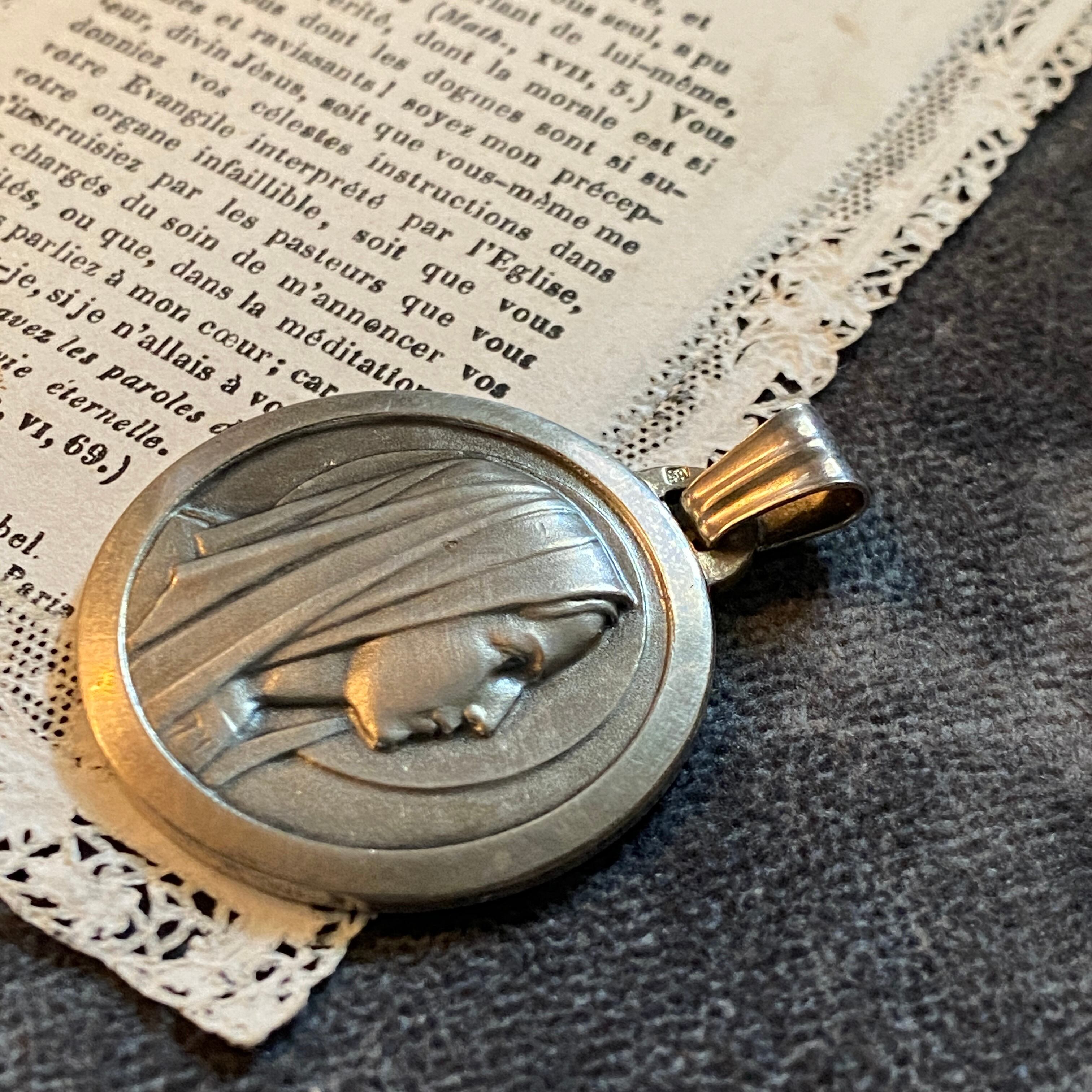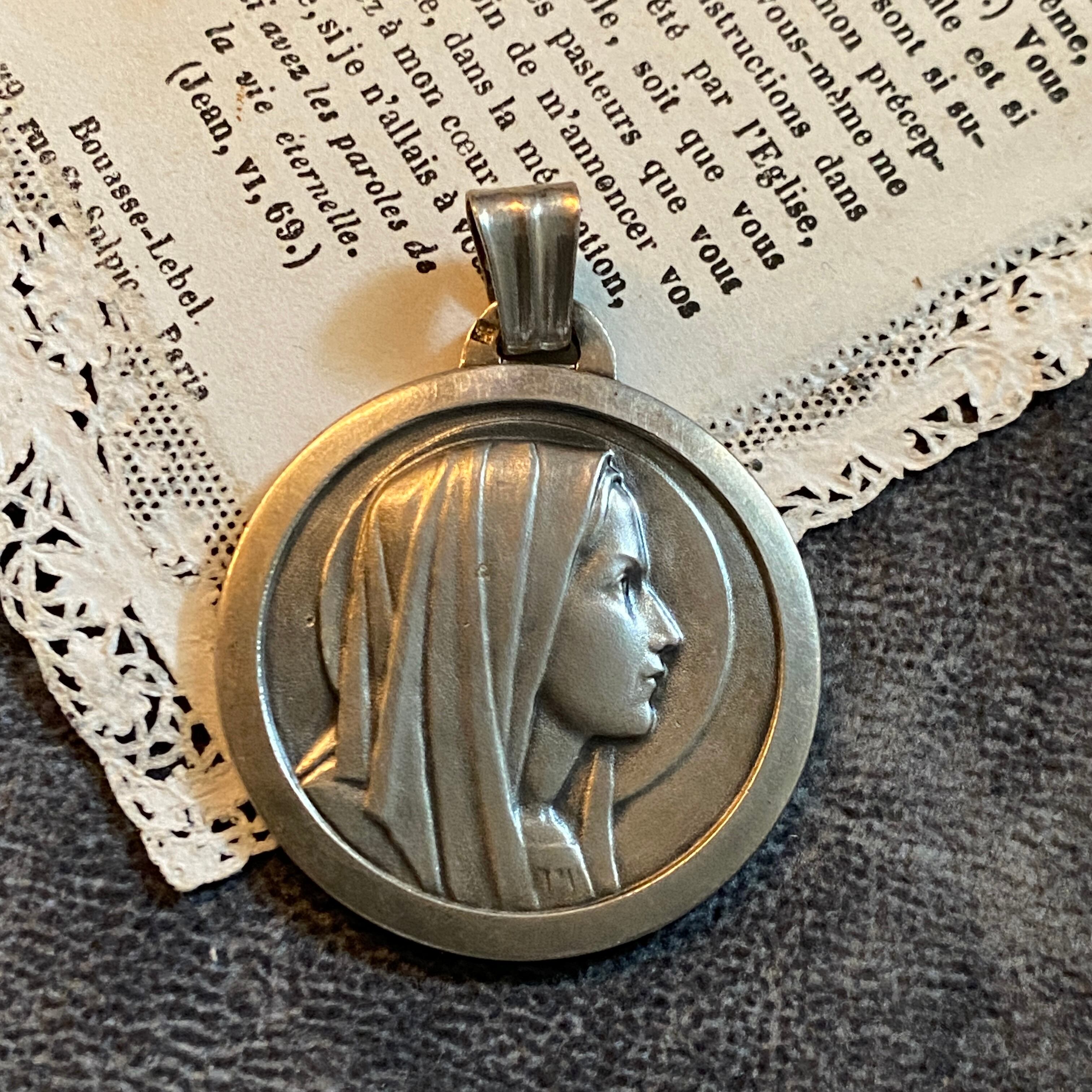 シンプルなリムに縁取られた祈りのマリアさまは、しっかりと前を見据えておいでです。