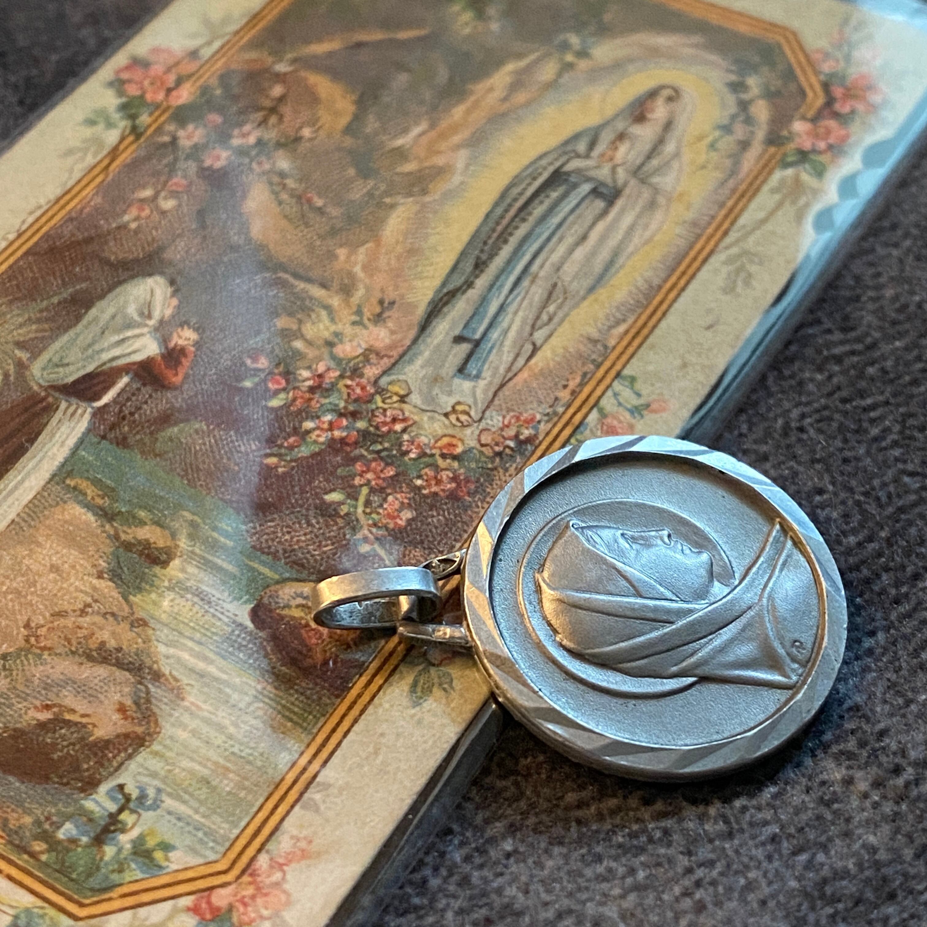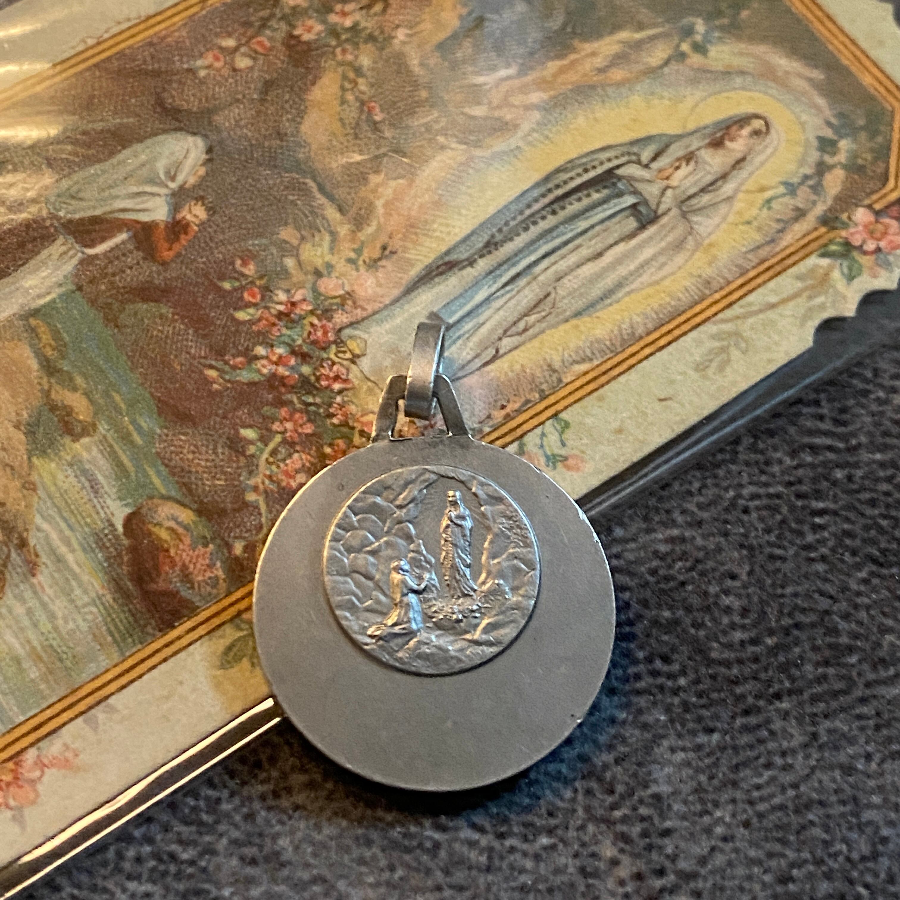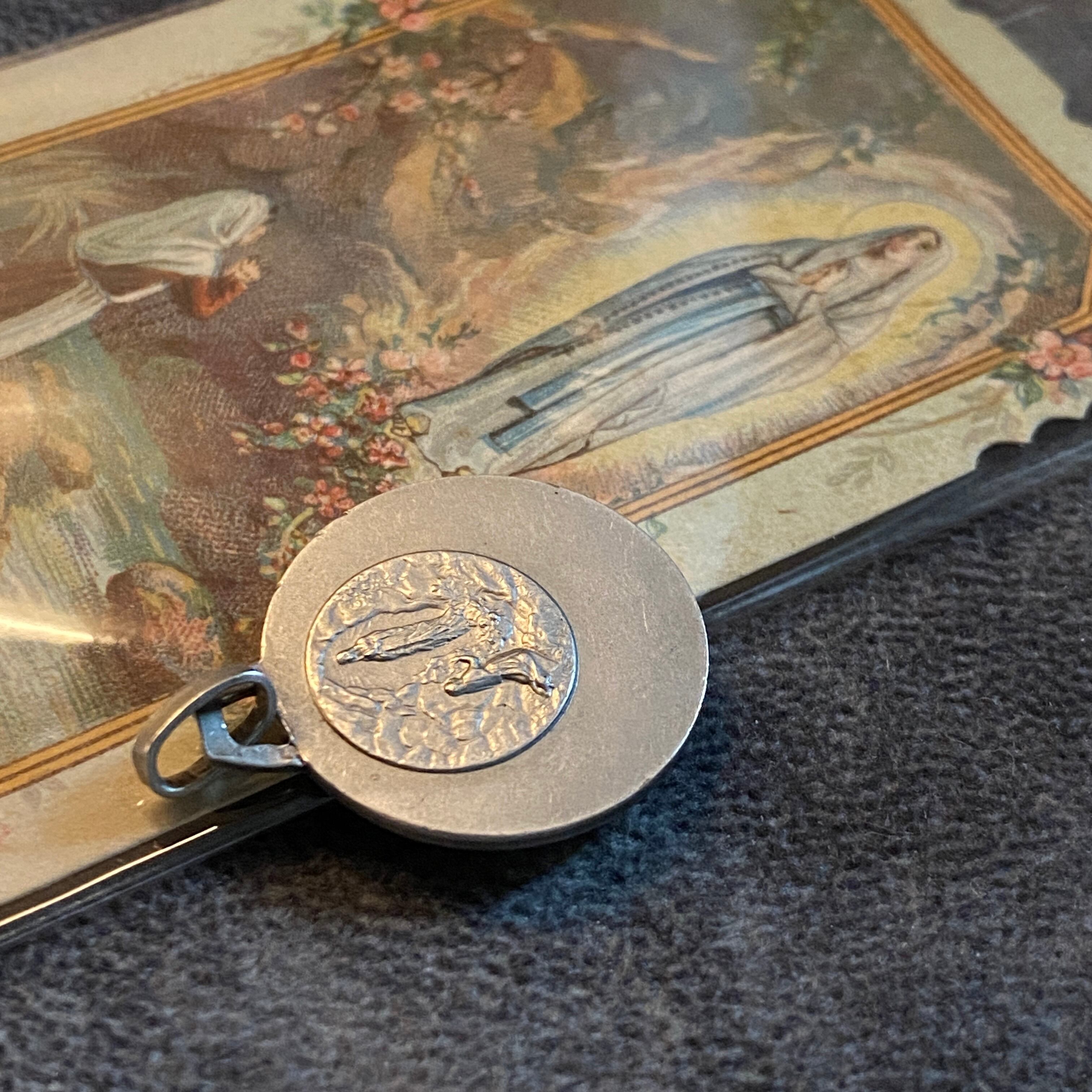 彫りの入ったデザインフレームが美しい作家作品のルルドのメダイ。